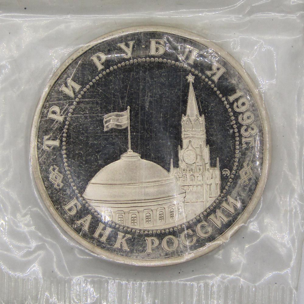 На аверсе монеты 3 рубля 1993 год «50-летие освобождения Киева от фашистских захватчиков»: в центре диска — в центре диска - изображения купола здания Сената и Спасской башни Московского Кремля, справа от них - товарный знак монетного двора. По окружности надписи, обрамлённые кругом из точек: вверху – «ТРИ РУБЛЯ 1993 г.», внизу – «БАНК РОССИИ».