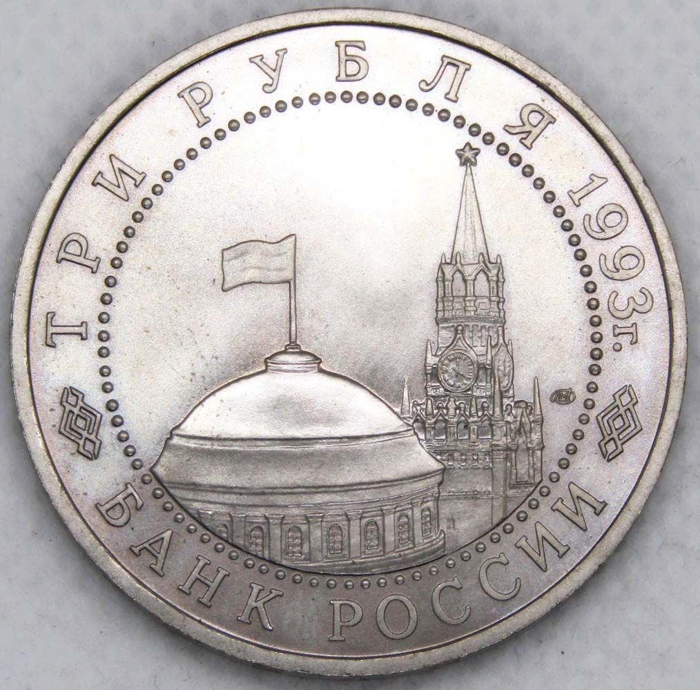 На аверсе монеты 3 рубля 1993 год «50-летие Победы на Курской дуге»: в центре диска — в центре диска - изображения купола здания Сената и Спасской башни Московского Кремля, справа от них - товарный знак монетного двора. По окружности надписи, обрамлённые кругом из точек: вверху – «ТРИ РУБЛЯ 1993 г.», внизу – «БАНК РОССИИ».