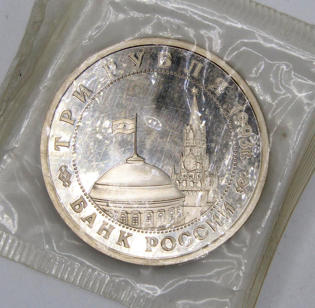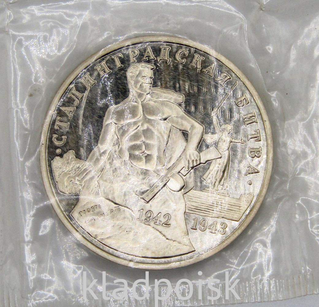 На аверсе монеты 3 рубля 1993 года «Сталинградская битва»: в центре - изображения купола здания Сената и Спасской башни Московского Кремля, справа от них - товарный знак монетного двора. По окружности надписи, разделённые орнаментом и обрамлённые кругом из точек: вверху - "ТРИ РУБЛЯ 1993 г.", внизу - "БАНК РОССИИ".