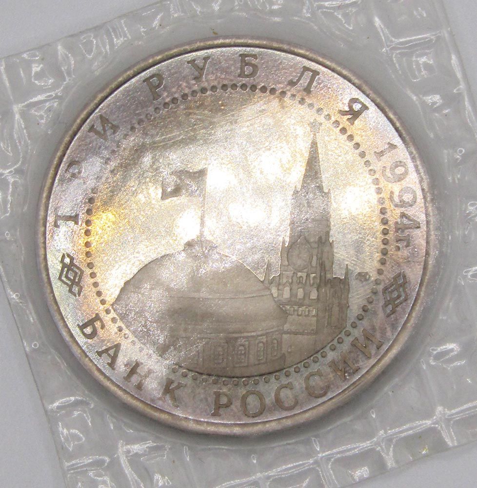 На аверсе монеты 3 рубля 1994 год «Освобождение Севастополя»: в центре диска — в центре диска - изображения купола здания Сената и Спасской башни Московского Кремля, справа от них - товарный знак монетного двора. По окружности надписи, обрамлённые кругом из точек: вверху – «ТРИ РУБЛЯ 1994 г.», внизу – «БАНК РОССИИ».