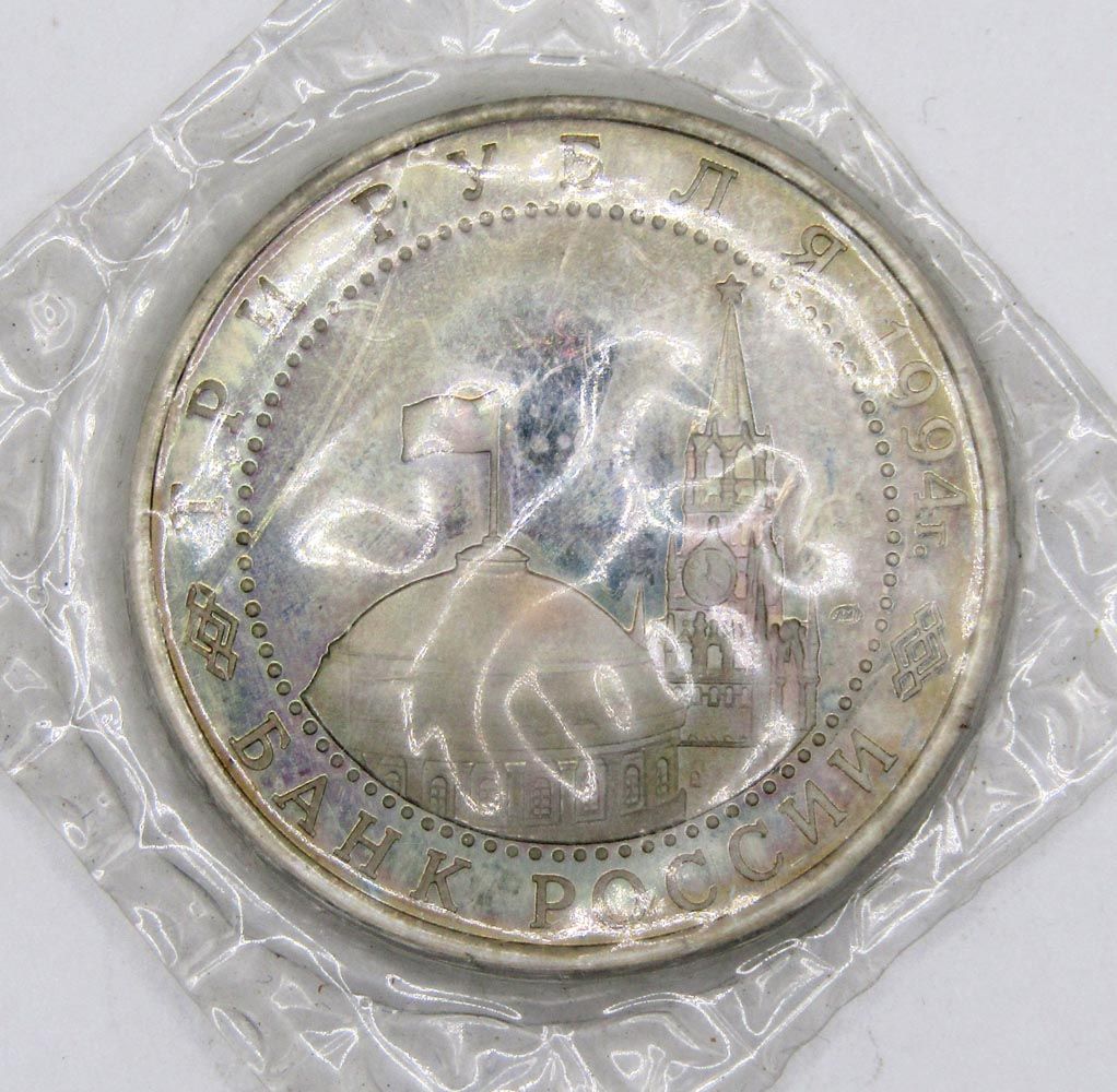 На аверсе монеты 3 рубля 1994 год «Освобождение Севастополя»: в центре диска — в центре диска - изображения купола здания Сената и Спасской башни Московского Кремля, справа от них - товарный знак монетного двора. По окружности надписи, обрамлённые кругом из точек: вверху – «ТРИ РУБЛЯ 1994 г.», внизу – «БАНК РОССИИ».