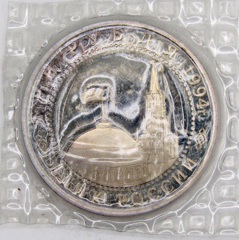 На аверсе монеты 3 рубля 1994 год «Освобождение Севастополя»: в центре диска — в центре диска - изображения купола здания Сената и Спасской башни Московского Кремля, справа от них - товарный знак монетного двора. По окружности надписи, обрамлённые кругом из точек: вверху – «ТРИ РУБЛЯ 1994 г.», внизу – «БАНК РОССИИ».