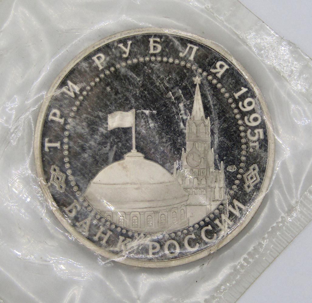 На аверсе монеты 3 рубля 1995 год «Берлин. Освобождение Европы от фашизма»: в центре диска — в центре диска - изображения купола здания Сената и Спасской башни Московского Кремля, справа от них - товарный знак монетного двора. По окружности надписи, обрамлённые кругом из точек: вверху – «ТРИ РУБЛЯ 1995 г.», внизу – «БАНК РОССИИ».