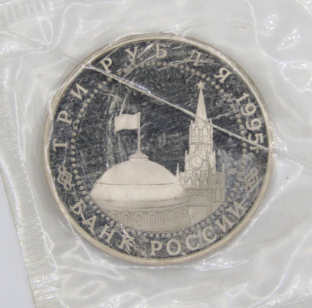 На аверсе монеты 3 рубля 1995 год «Безоговорочная капитуляция Японии»: в центре диска — в центре диска - изображения купола здания Сената и Спасской башни Московского Кремля, справа от них - товарный знак монетного двора. По окружности надписи, обрамлённые кругом из точек: вверху – «ТРИ РУБЛЯ 1995 г.», внизу – «БАНК РОССИИ».