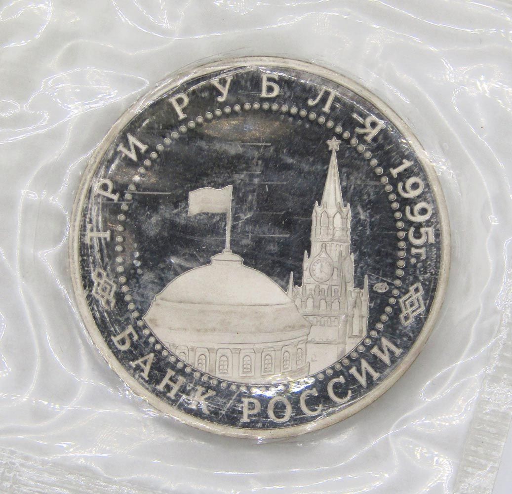 На аверсе монеты 3 рубля 1995 год «Безоговорочная капитуляция Японии»: в центре диска — в центре диска - изображения купола здания Сената и Спасской башни Московского Кремля, справа от них - товарный знак монетного двора. По окружности надписи, обрамлённые кругом из точек: вверху – «ТРИ РУБЛЯ 1995 г.», внизу – «БАНК РОССИИ».
