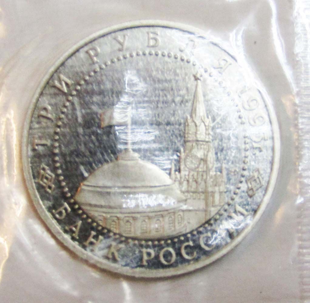 На аверсе монеты 3 рубля 1995 год «Безоговорочная капитуляция Японии»: в центре диска — в центре диска - изображения купола здания Сената и Спасской башни Московского Кремля, справа от них - товарный знак монетного двора. По окружности надписи, обрамлённые кругом из точек: вверху – «ТРИ РУБЛЯ 1995 г.», внизу – «БАНК РОССИИ».