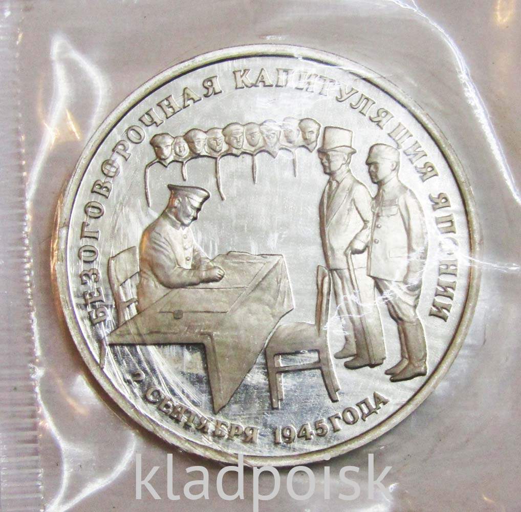 На реверсе монеты 3 рубля 1995 год «Безоговорочная капитуляция Японии» изображения представителей СССР и Японии в момент подписания Акта о безоговорочной капитуляции Японии, по окружности надписи: вверху — «БЕЗОГОВОРОЧНАЯ КАПИТУЛЯЦИЯ ЯПОНИИ», внизу -«2 СЕНТЯБРЯ 1945 ГОДА».