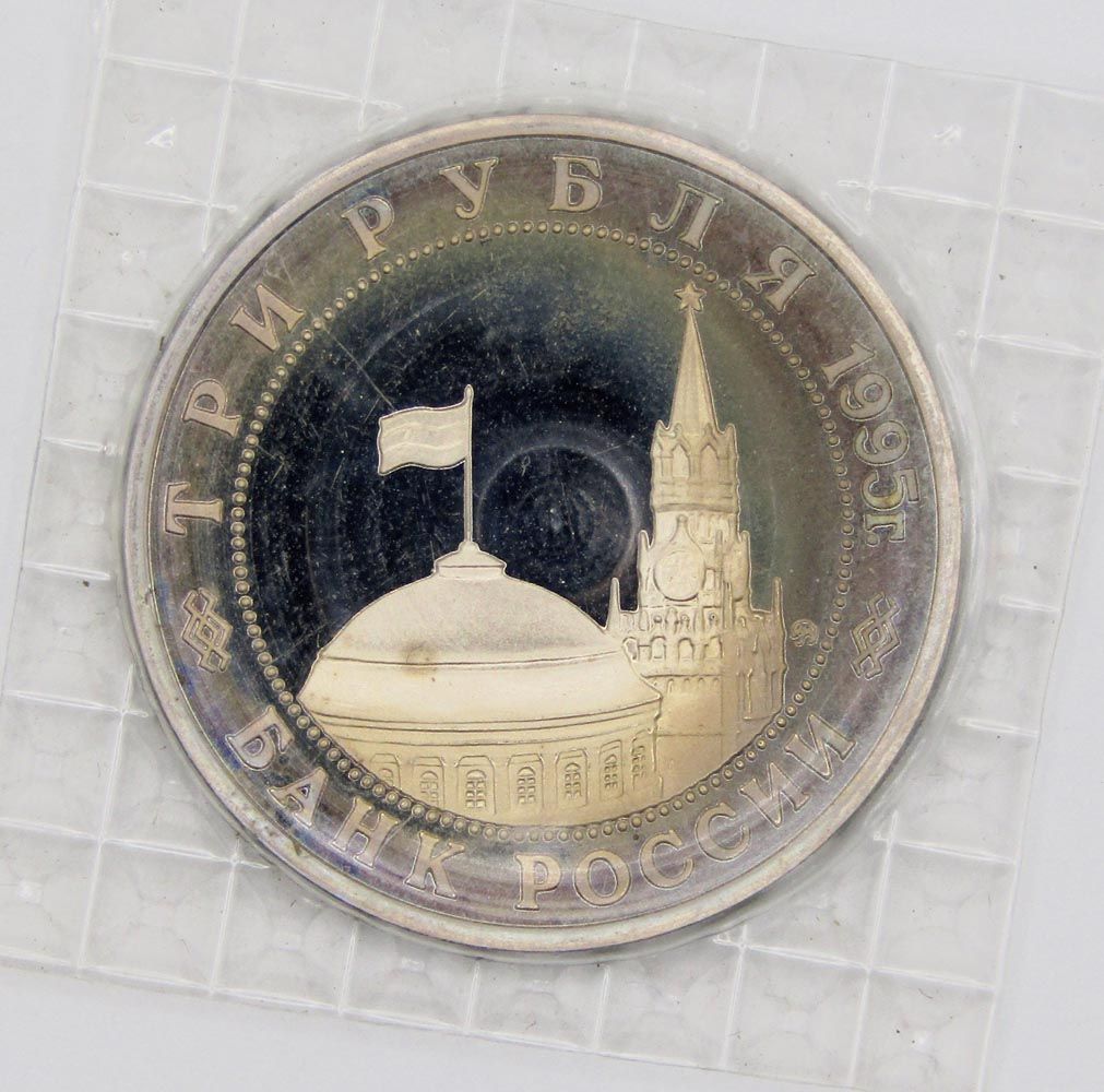 На аверсе монеты 3 рубля 1995 год «Кенигсберг. Освобождение Европы от фашизма»: в центре диска — в центре диска - изображения купола здания Сената и Спасской башни Московского Кремля, справа от них - товарный знак монетного двора. По окружности надписи, обрамлённые кругом из точек: вверху – «ТРИ РУБЛЯ 1995 г.», внизу – «БАНК РОССИИ».