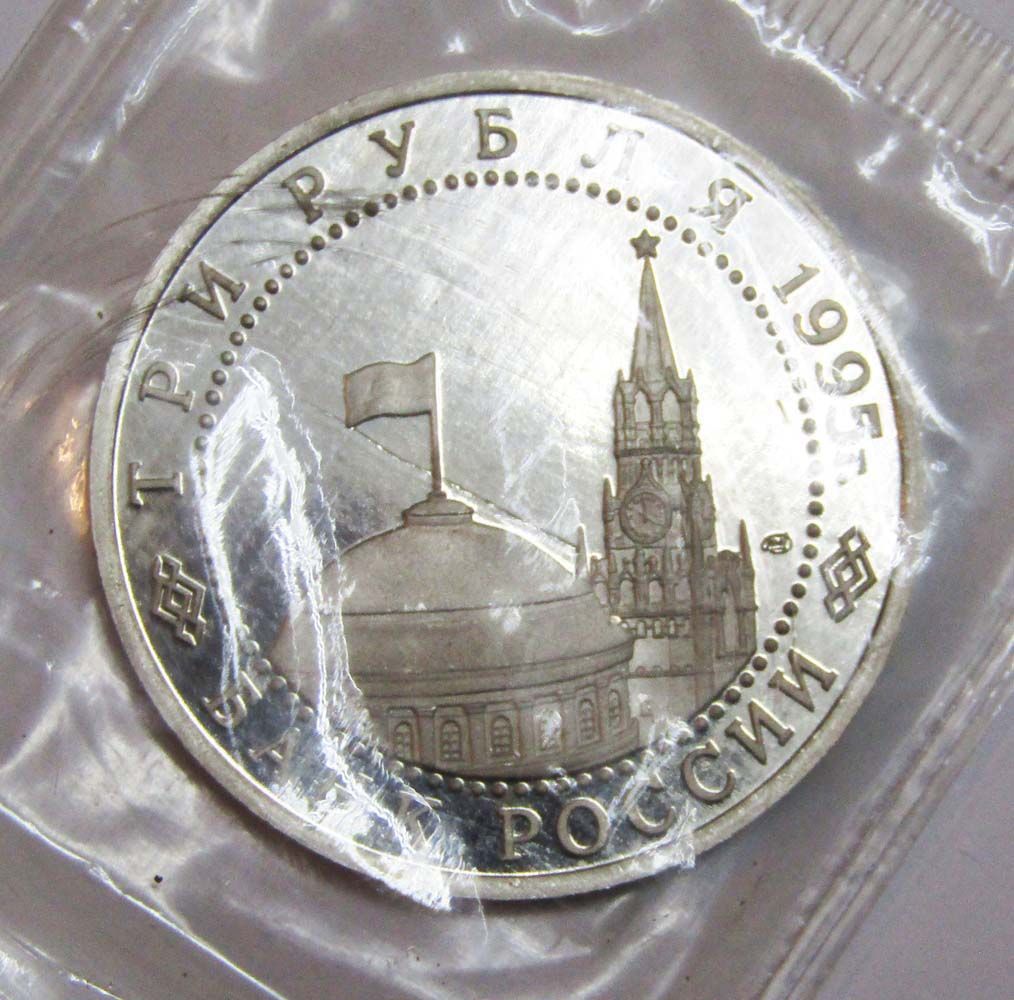 На аверсе монеты 3 рубля 1995 год «Варшава. Освобождение Европы от фашизма»: в центре диска — в центре диска - изображения купола здания Сената и Спасской башни Московского Кремля, справа от них - товарный знак монетного двора. По окружности надписи, обрамлённые кругом из точек: вверху – «ТРИ РУБЛЯ 1995 г.», внизу – «БАНК РОССИИ».