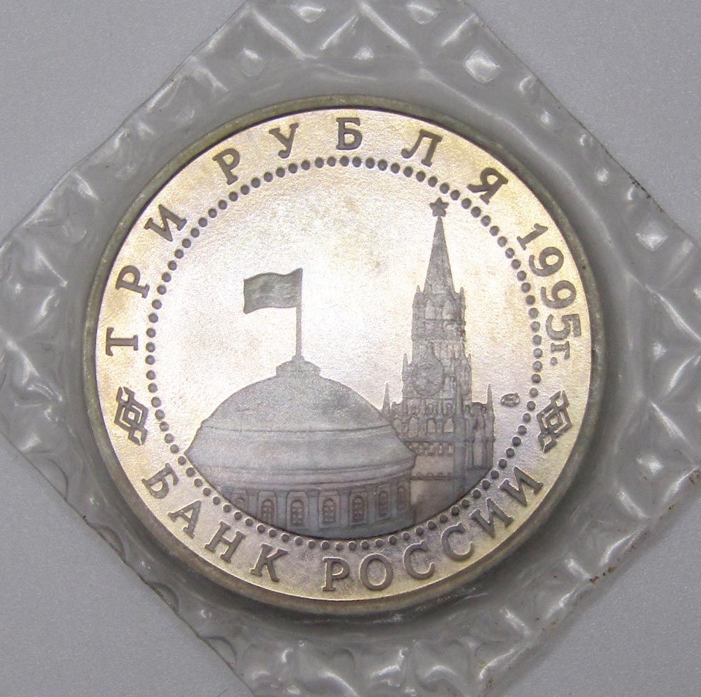 На аверсе монеты 3 рубля 1995 год «Варшава. Освобождение Европы от фашизма»: в центре диска — в центре диска - изображения купола здания Сената и Спасской башни Московского Кремля, справа от них - товарный знак монетного двора. По окружности надписи, обрамлённые кругом из точек: вверху – «ТРИ РУБЛЯ 1995 г.», внизу – «БАНК РОССИИ».