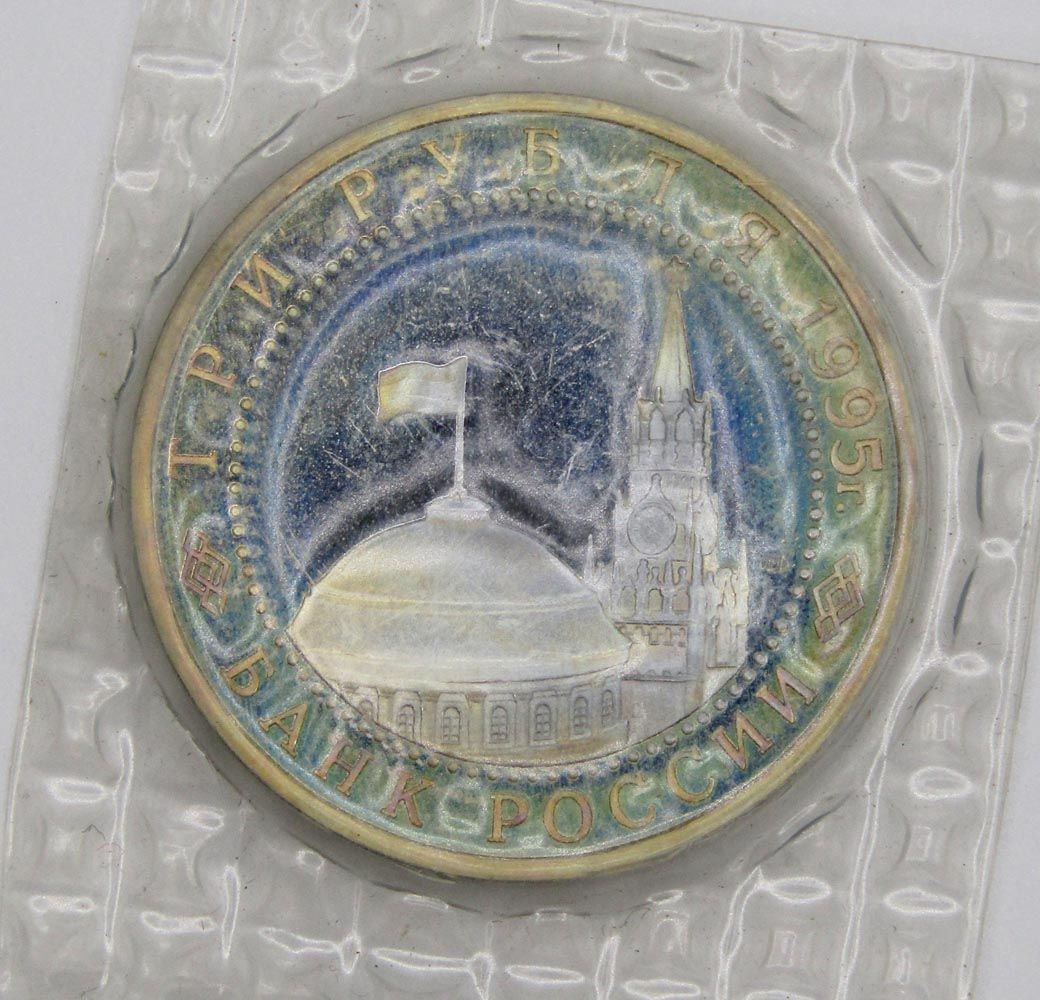 На аверсе монеты 3 рубля 1995 год «Варшава. Освобождение Европы от фашизма»: в центре диска — в центре диска - изображения купола здания Сената и Спасской башни Московского Кремля, справа от них - товарный знак монетного двора. По окружности надписи, обрамлённые кругом из точек: вверху – «ТРИ РУБЛЯ 1995 г.», внизу – «БАНК РОССИИ».
