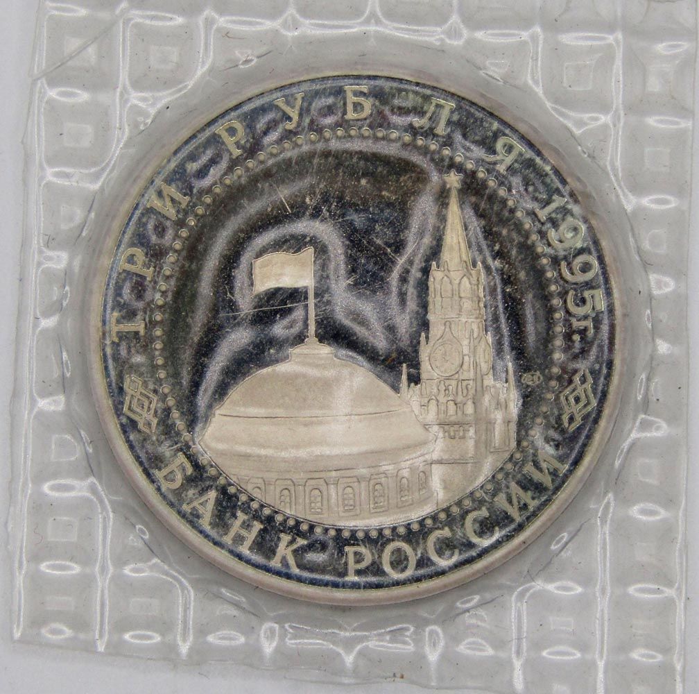 На аверсе монеты 3 рубля 1995 год «Варшава. Освобождение Европы от фашизма»: в центре диска — в центре диска - изображения купола здания Сената и Спасской башни Московского Кремля, справа от них - товарный знак монетного двора. По окружности надписи, обрамлённые кругом из точек: вверху – «ТРИ РУБЛЯ 1995 г.», внизу – «БАНК РОССИИ».