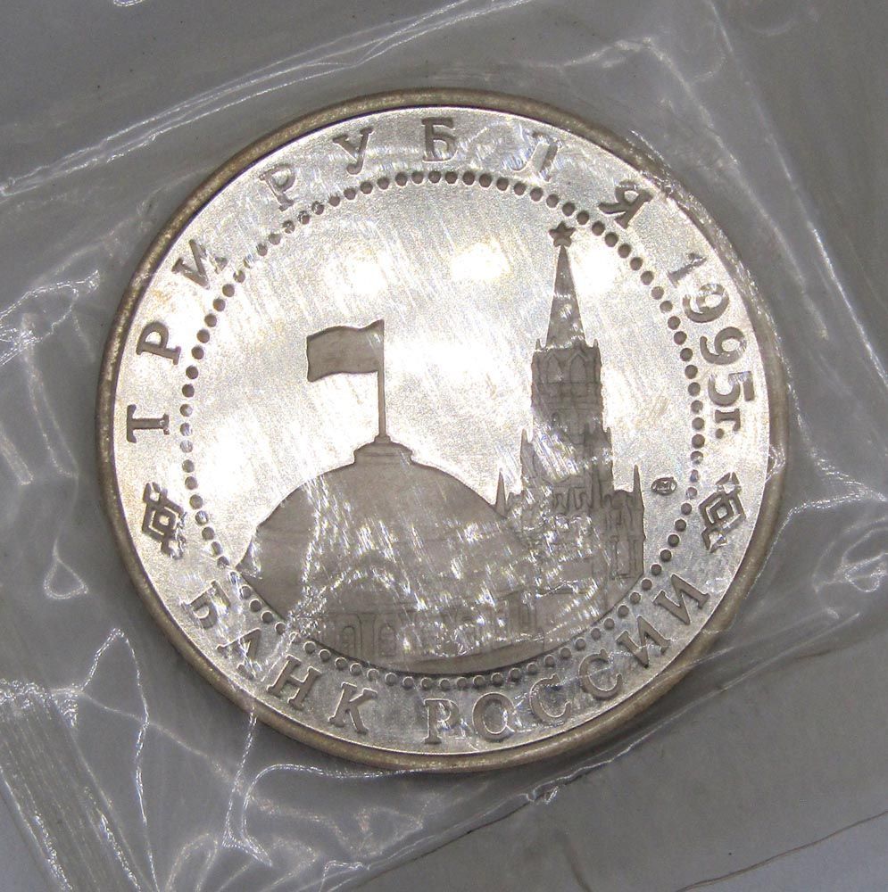 На аверсе монеты 3 рубля 1995 год «Вена. Освобождение Европы от фашизма»: в центре диска — в центре диска - изображения купола здания Сената и Спасской башни Московского Кремля, справа от них - товарный знак монетного двора. По окружности надписи, обрамлённые кругом из точек: вверху – «ТРИ РУБЛЯ 1995 г.», внизу – «БАНК РОССИИ».