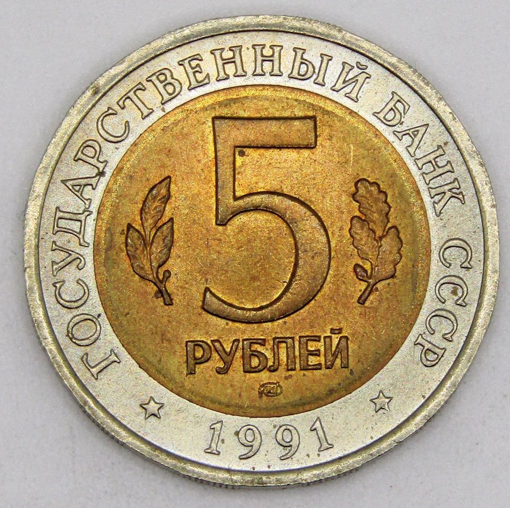 Аверс: сверху вдоль края монеты слова «ГОСУДАРСТВЕННЫЙ БАНК СССР», внизу год чеканки «1991», в середине номинал «5», слева - лавровая ветвь, справа - дубовая ветвь, ниже слово «РУБЛЕЙ», ниже монограмма монетного двора «ЛМД».