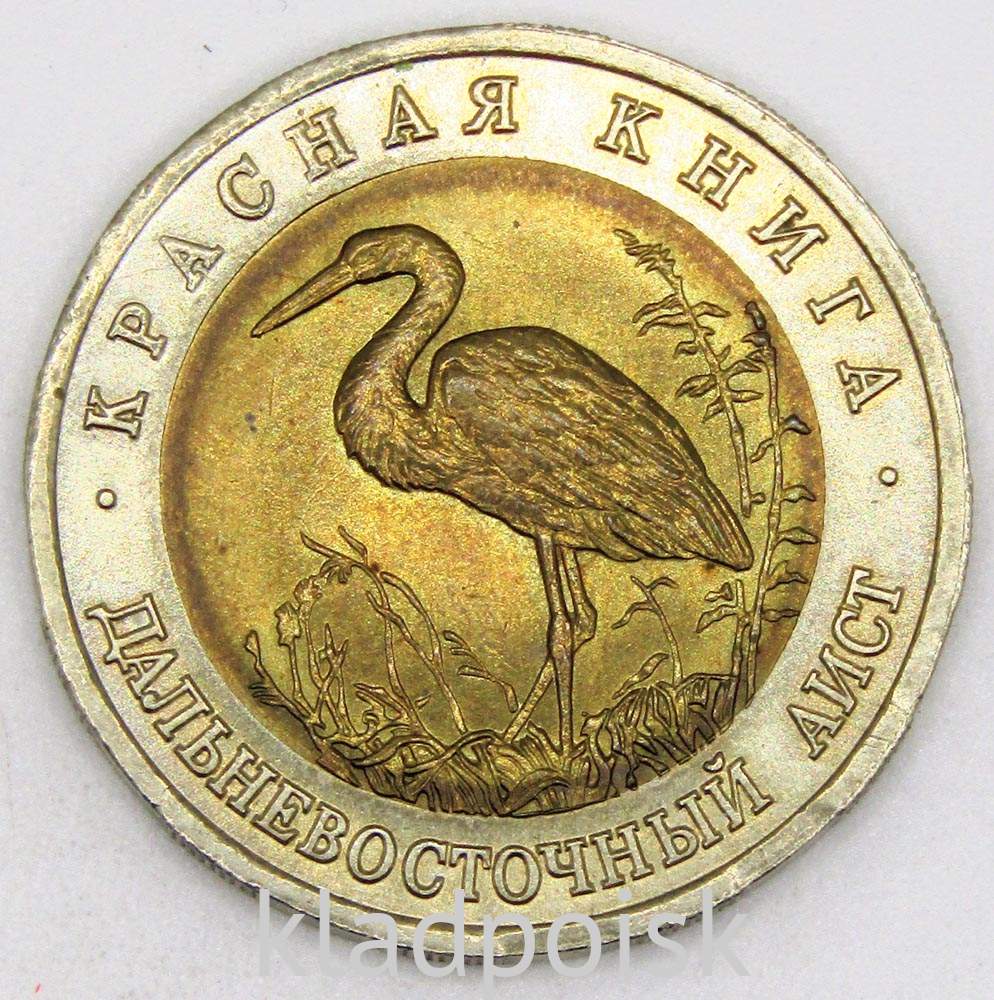 Реверс: изображение дальневосточного аиста на фоне травянистой растительности, по окружности надписи, разделённые двумя точками: вверху — «КРАСНАЯ КНИГА», внизу — «ДАЛЬНЕВОСТОЧНЫЙ АИСТ».