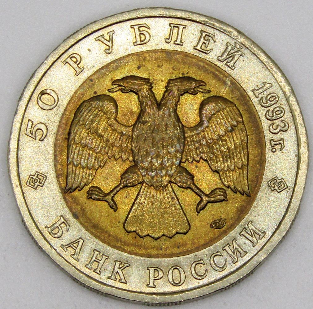 Аверс: в центре диска — эмблема Банка России (двуглавый орёл художника И. Билибина), под ним справа — товарный знак монетного двора, по окружности надписи: вверху — «50 РУБЛЕЙ 1993 г.», внизу — «БАНК РОССИИ».