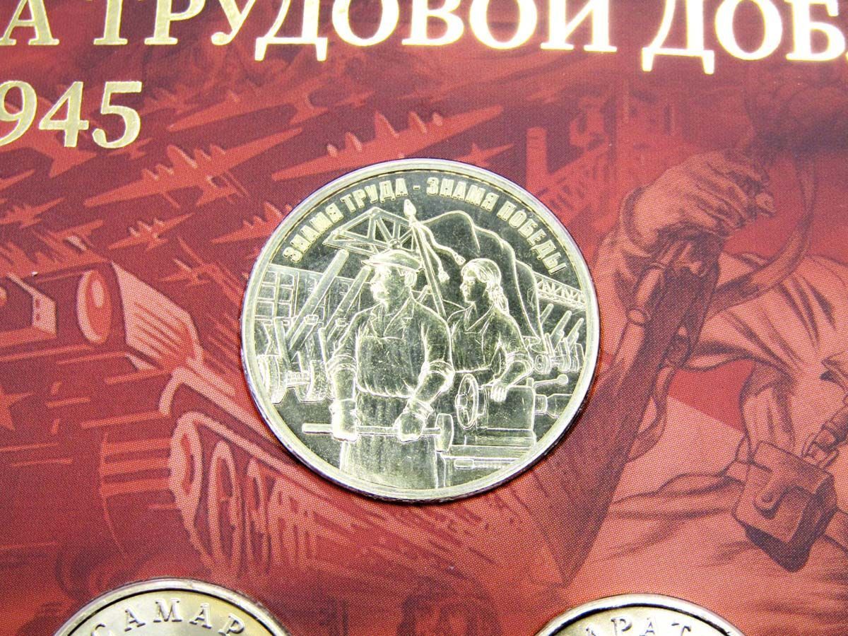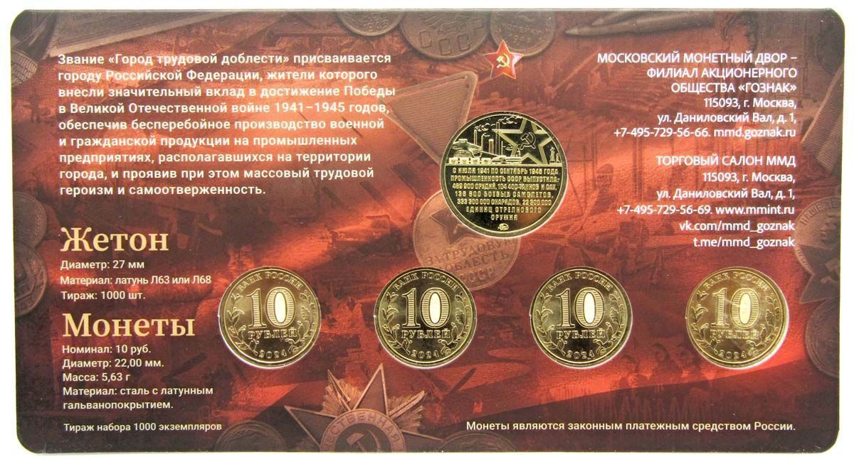 Набop cоcтоит из монет номиналом 10 рублей серии Города Трудовой Доблести - Пepмь, Сaмapa, Cаратов, Tомск и памятного жeтoнa из лaтуни.