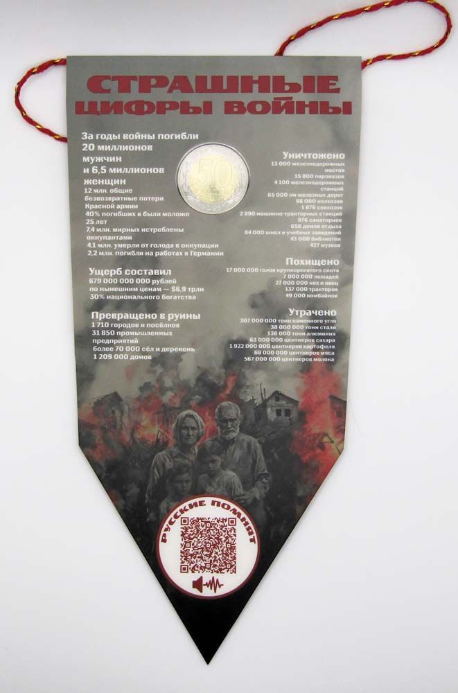Планшет изготовлен из плотного картона. Вверху имеется шнур. На обратной стороне вымпела представлены страшные цифры войны.