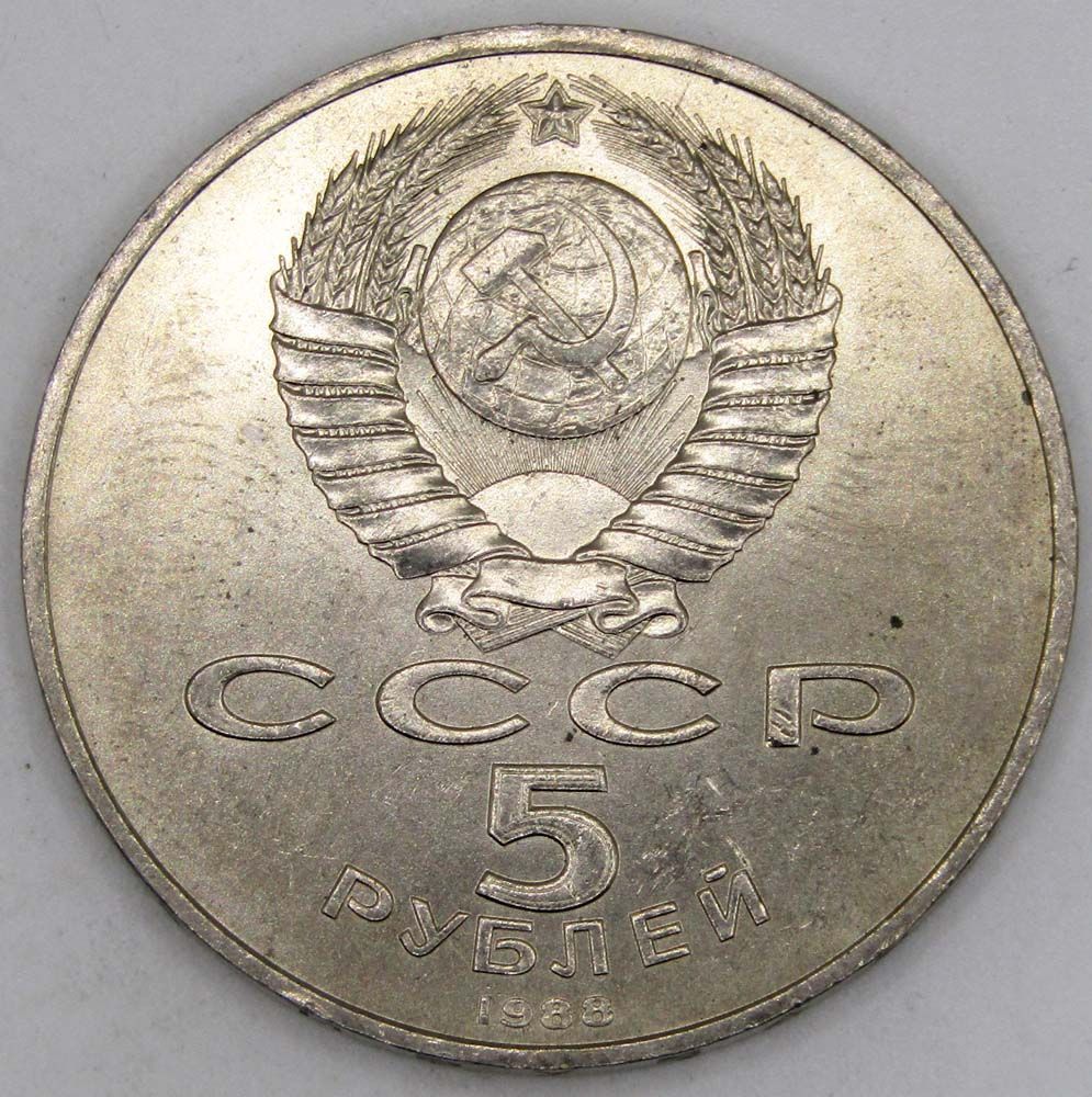 На аверсе монеты 5 рублей 1988 года, Памятник Петру Первому в Ленинграде изображение Государственного герба Союза Советских Социалистических Республик, номинал монеты и год чеканки.