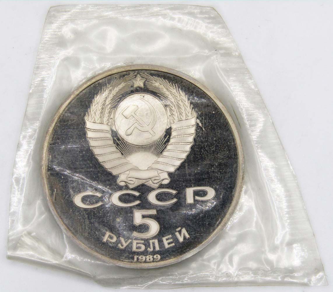 На аверсе монеты 5 рублей 1989 года, Благовещенский собор Московского Кремля изображение Государственного герба Союза Советских Социалистических Республик, номинал монеты и год чеканки.
