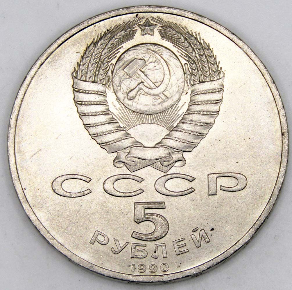 На аверсе монеты 5 рублей 1990 года, Успенский собор в Москве изображение Государственного герба Союза Советских Социалистических Республик, номинал монеты и год чеканки.