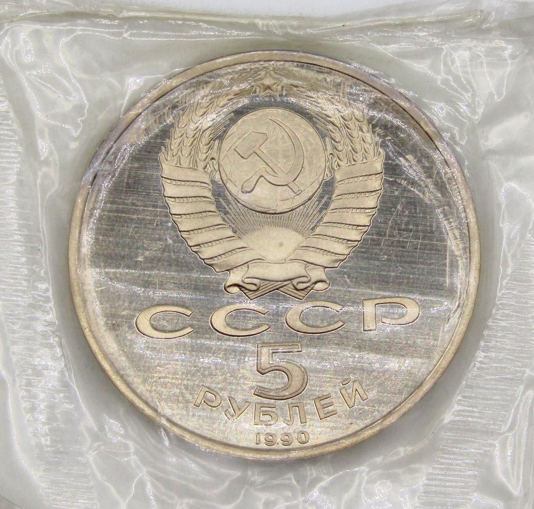 На аверсе монеты 5 рублей 1990 года, Успенский собор в Москве изображение Государственного герба Союза Советских Социалистических Республик, номинал монеты и год чеканки.
