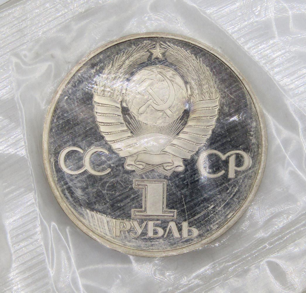 На аверсе монеты 1 рубль 1982 60 лет СССР изображен Государственный герб Союза Советских Социалистических Республик, номинал монеты и год чеканки.