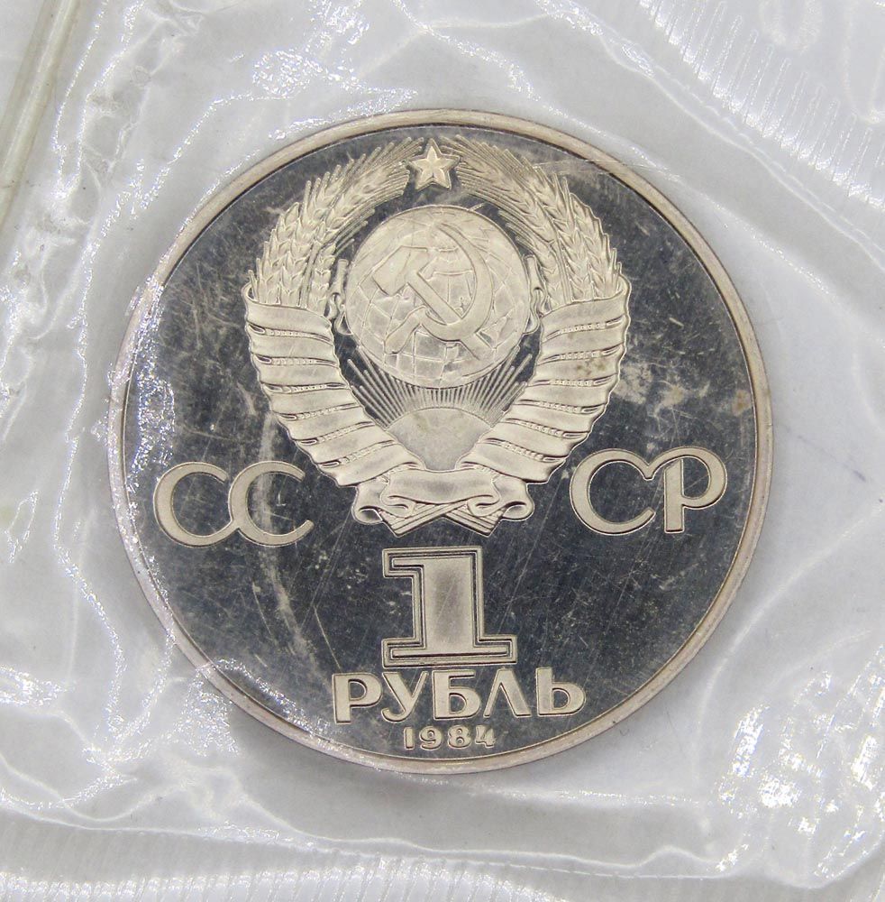 На аверсе монеты 1 рубль 1984 125-летие со дня рождения русского физика А.С. Попова изображен Государственный герб Союза Советских Социалистических Республик, номинал монеты и год чеканки.