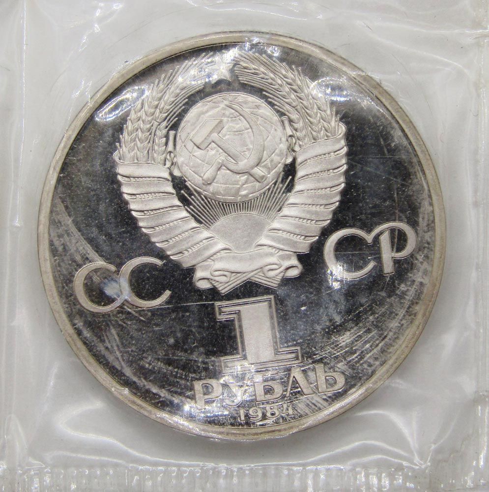 На аверсе монеты 1 рубль 1984 год 185-лет со дня рождения русского поэта А.С. Пушкина изображен Государственный герб Союза Советских Социалистических Республик, номинал монеты и год чеканки.