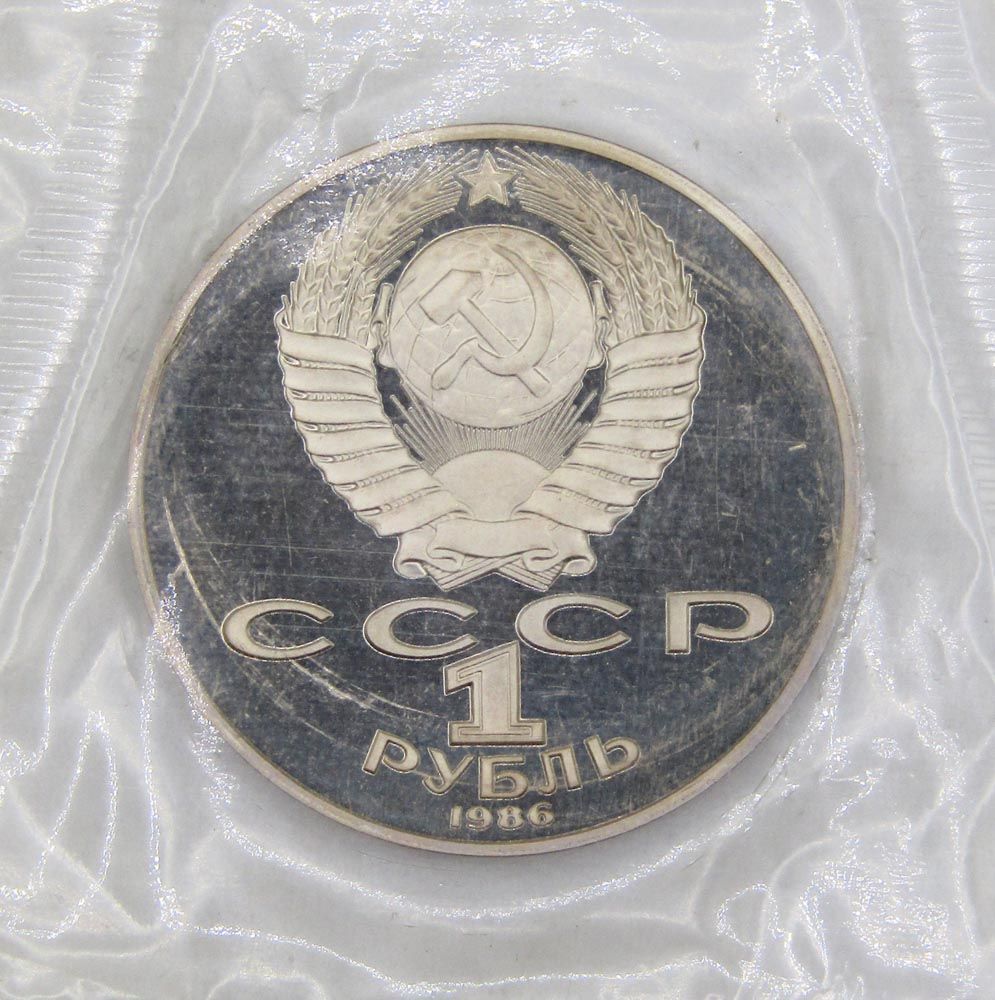 На аверсе монеты 1 рубль 1986 год СССР Михаил Васильевич Ломоносов изображение Государственного герба Союза Советских Социалистических Республик, номинал монеты и год чеканки.