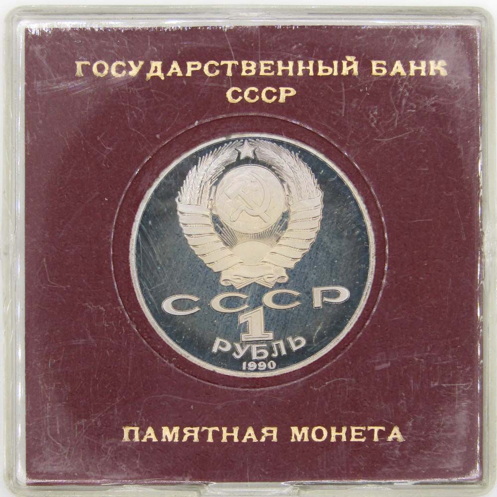 На реверсе монеты 1 рубль СССР 1990 года 150 лет со дня рождения П.И. Чайковского изображен фрагмент памятника Петру Ильичу Чайковскому на фоне нотного стана, факсимильная подпись, годы жизни «1840» «1893», надпись полукругом «П. ЧАЙКОВСКИЙ».