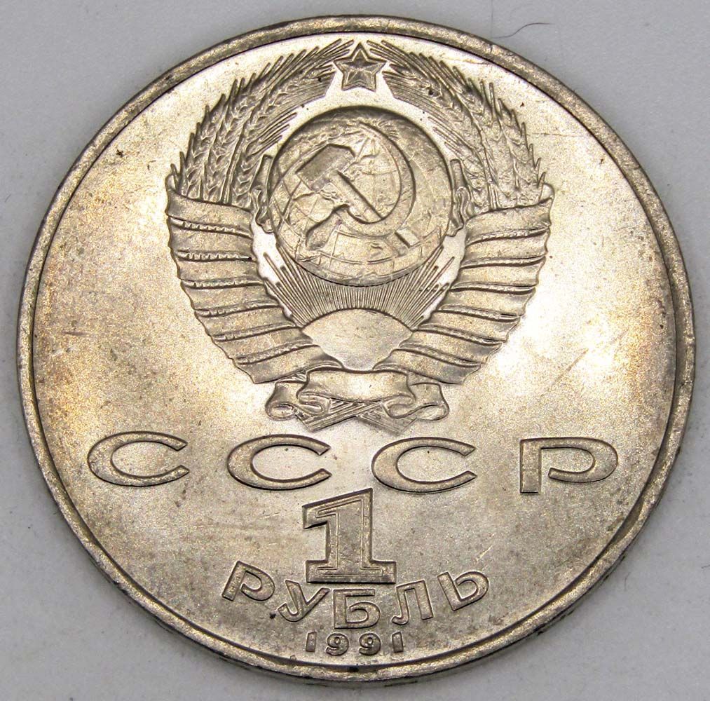 На реверсе монеты 1 рубль СССР 1991 года 850 лет со дня рождения Низами Гянджеви изображение Низами Гянджеви с пером в момент создания стихотворения, надписи: "НИЗАМИ ГЯНДЖЕВИ", "850 лет".
