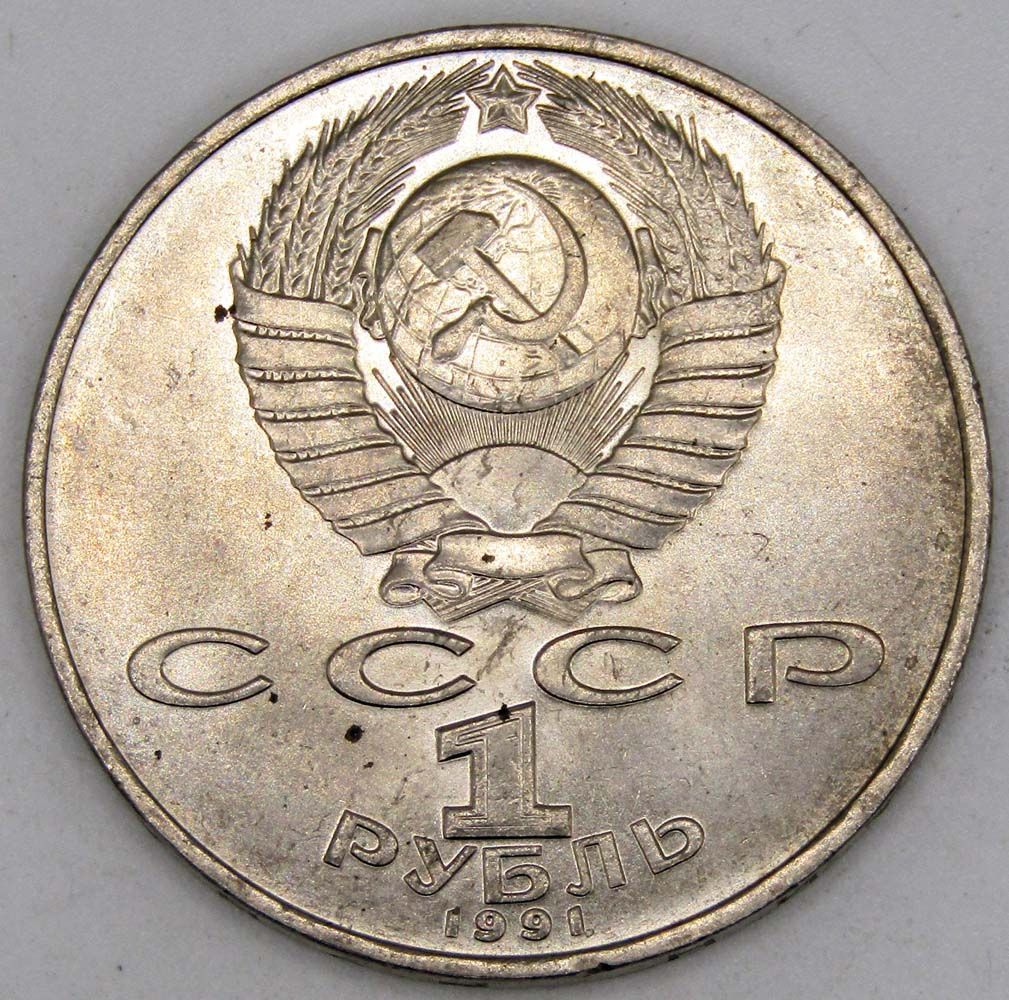 На реверсе монеты 1 рубль СССР 1991 года 850 лет со дня рождения Низами Гянджеви изображение Низами Гянджеви с пером в момент создания стихотворения, надписи: "НИЗАМИ ГЯНДЖЕВИ", "850 лет".