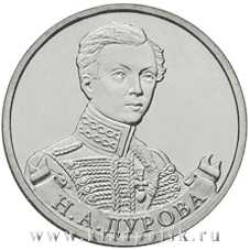 В 2012 году Центральным Банком Российской федерации была выпущена в обращение серия монет «Полководцы и герои Отечественной войны 1812 года». В этой серии 16 памятных монет. 2 рубля «Штабс-ротмистр Н.А Дурова» - восьмая юбилейная монета этой серии, выпущена 1 августа 2012 года.