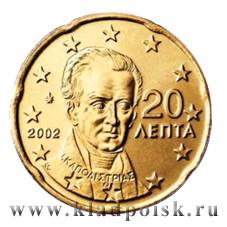Ещё с античных времён название мелких монет в Греции имело название лепта, от слова LEPTON – маленький, тонкий. Выражение «внести свою лепту» пошло от упоминания в Библии о том, что бедная женщина, вдова положила в сокровищницу храма две лепты.<br /> <br /> На аверсе монеты 20 центов Греция изображение государственного деятеля графа Иоанна Каподистрия, первого правителя независимой Греции времён войны за освобождение Греции от турецкого ига.<br /> <br />