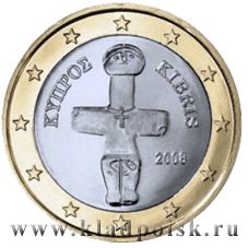 На аверсе монеты 1 Евро Кипр изображение Помосского идола, древней кипрской деревни Помос. Крестообразная скульптура изображает женщину с разведёнными в разные стороны руками и крестом на шее. В эпоху энеолита Помосский идол символизировал плодородие, фигурки носили в качестве оберега на шее. <br /> Сейчас скульптура выставлена в Археологическом музее Кипра в Никосии.<br />
