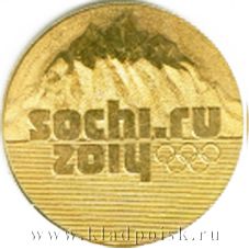 Монета Сочи Горы позолоченная. Неофициальный выпуск. Чеканка Санкт-Петербургского монетного двора. Монета цвета Олимпийской золотой медали.