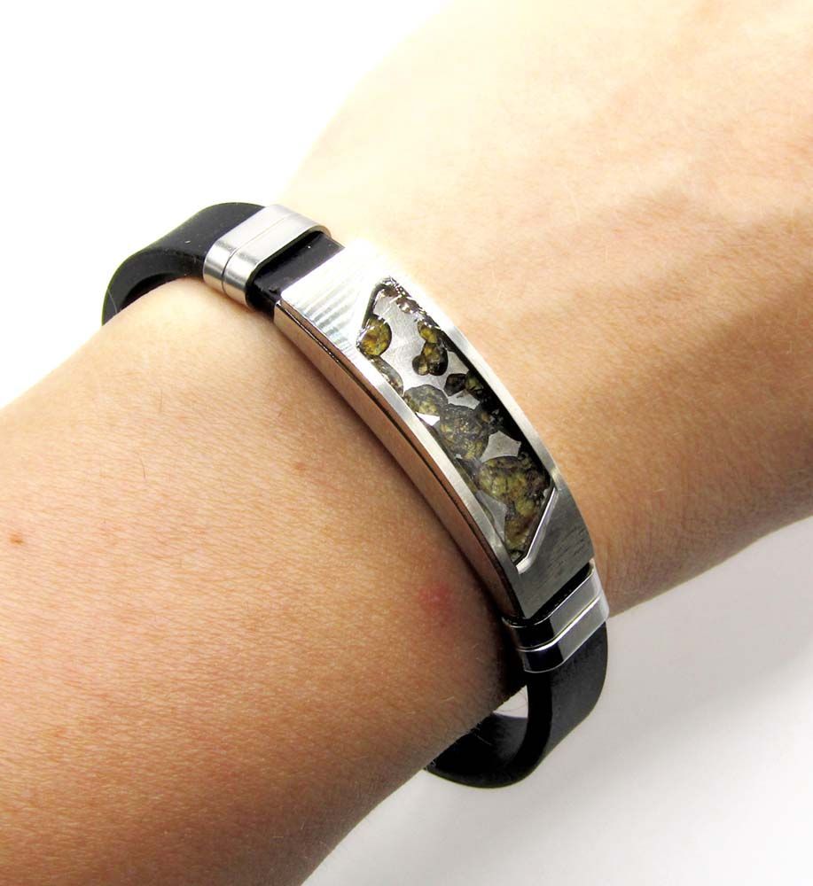 Браслет выполнен из искусственного каучука и нержавеющей стали. Метеоритная пластина 30*10 мм закреплена в стальной оправе и закрыта стеклом.
