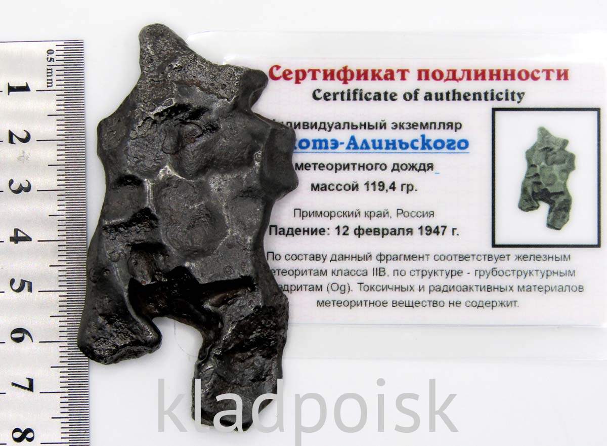 Индивидуальный экземпляр железного метеорита, выпавшего в виде железного дождя над Россией в 1947 году. Согласно лабораторным исследованиям возраст Сихотэ-Алинского метеорита 4 000 000 000 лет.