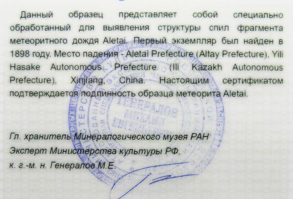 Первый экземпляр метеорита Aletai был найден в 1898 году в северной части Синьцзян-Уйгурского автономного района в Китае. Место падения - Aletai Prefecture (Altay Prefecture), Yili Hasake Autonomous Prefecture (Ili Kazakh Autonomous Prefecture), Xinjiang, China.