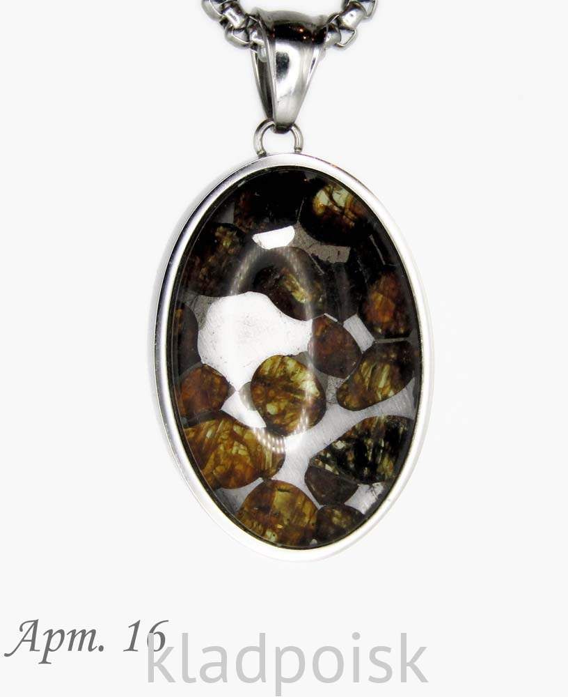 Кулон выполнен из стали. В оправу помещена пластина из метеорита Sericho, с лицевой стороны вставка закрыта выпуклым стеклом.