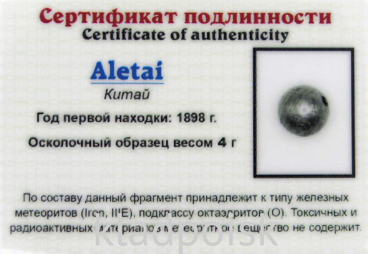 Первый экземпляр метеорита Aletai был найден в 1898 году в северной части Синьцзян-Уйгурского автономного района в Китае. Место падения - Aletai Prefecture (Altay Prefecture), Yili Hasake Autonomous Prefecture (Ili Kazakh Autonomous Prefecture), Xinjiang, China.