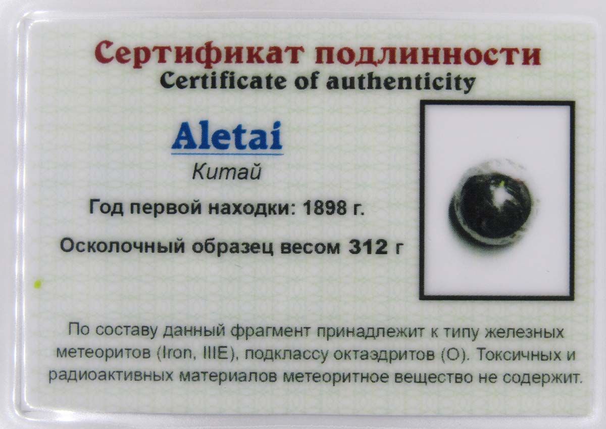 Данный образец представляет собой специально обработанный фрагмент метеоритного дождя Aletai.