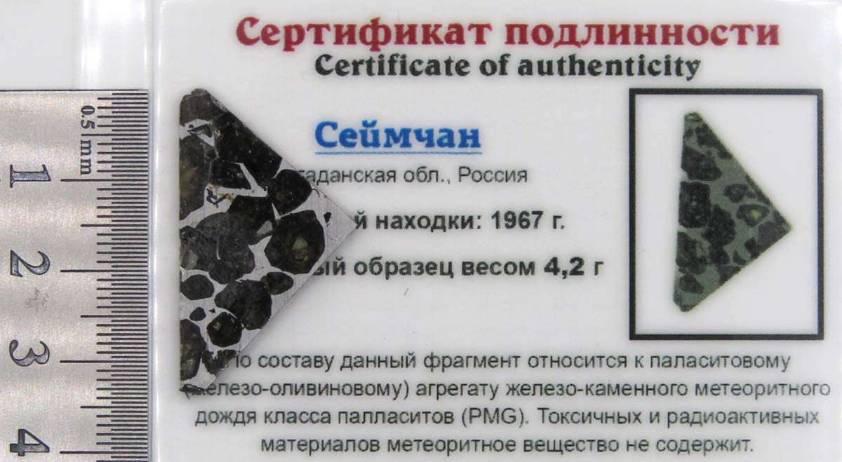Современные исследования показали, что по структуре эти экземпляры являются железокаменными метеоритами – палласитами, что привело к переклассификации этого метеорита. Он перешел в главную химическую группу более редкого класса паласситов (Pallasite, PMG). Таким образом, метеорит Сеймчан представляет собой редкий тип метеоритов, у которого встречаются чисто железные фрагменты и палласитовые фрагменты, но бывают и экземпляры, в которых две эти составляющие находятся в различных пропорциях.