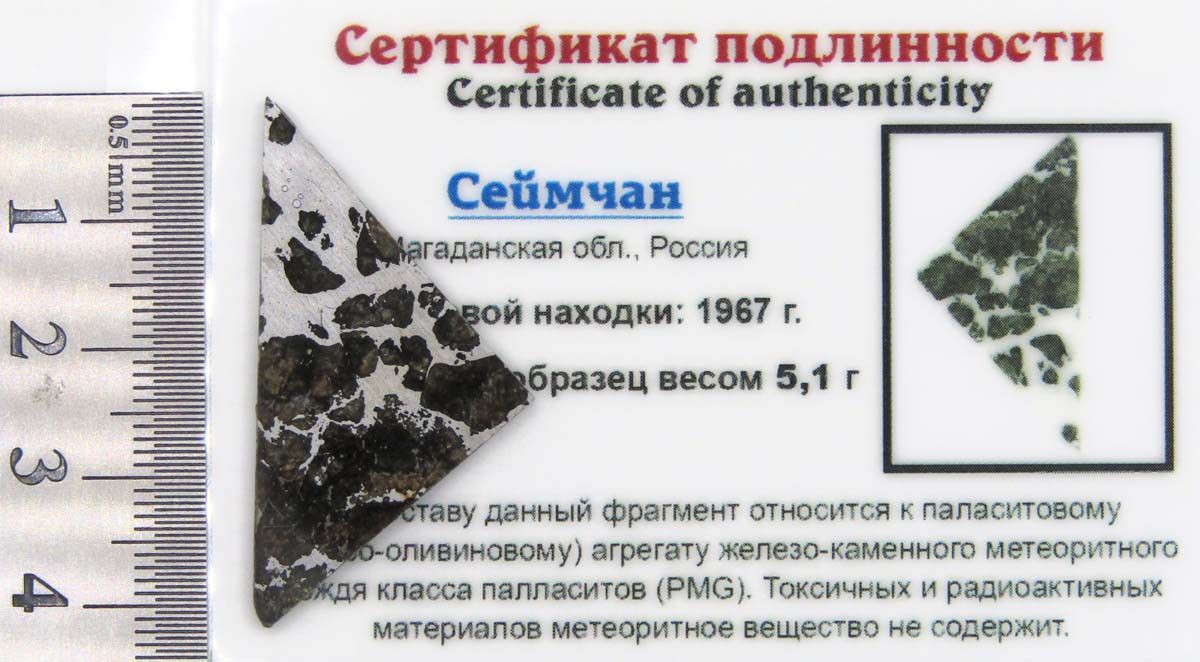 Современные исследования показали, что по структуре эти экземпляры являются железокаменными метеоритами – палласитами, что привело к переклассификации этого метеорита. Он перешел в главную химическую группу более редкого класса паласситов (Pallasite, PMG). Таким образом, метеорит Сеймчан представляет собой редкий тип метеоритов, у которого встречаются чисто железные фрагменты и палласитовые фрагменты, но бывают и экземпляры, в которых две эти составляющие находятся в различных пропорциях.