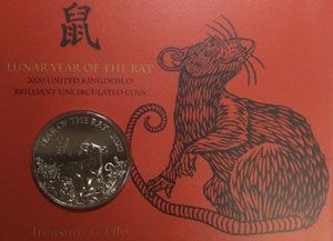 Памятная монета 5 фунтов Великобритании в буклете "2020 год крысы"